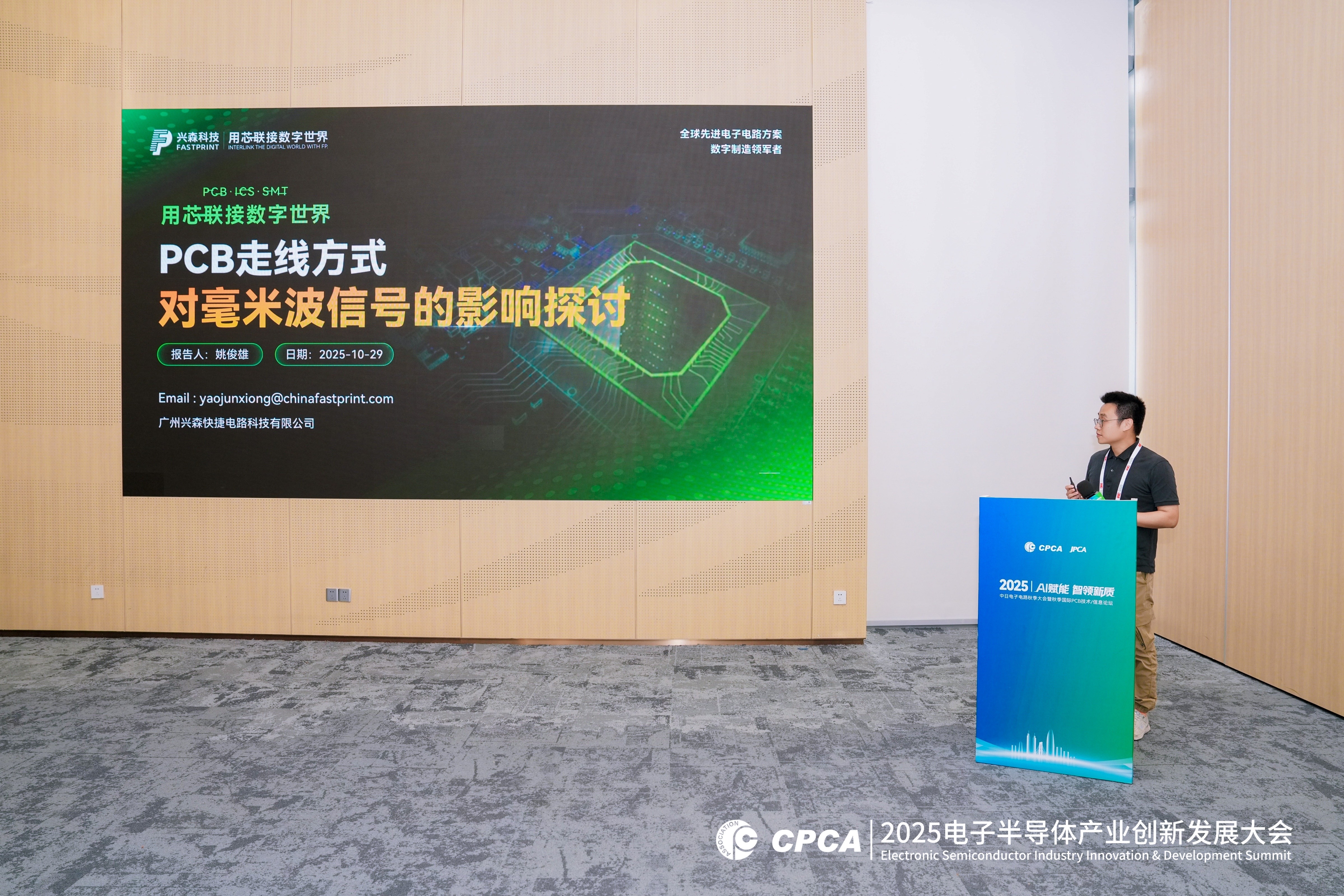 展会同期,10月28日-29日举办的2025中日电子电路秋季大会暨秋季国际PCB技术/信息论坛成为技术交流的重要平台。兴森科技两位工程师在技术分论坛上带来精彩分享:姚俊雄发表了《PCB走线方式对毫米波信号的影响探讨》论文,对48G射频线路常见的不同拐角走线以及不同电阻端接方式所产生的插损进行了对比,并给出相关的设计建议,优先对插损影响最小的方式进行布线。